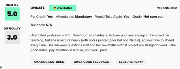 Read more at Professor Washburn’s ratemyprofessors page (spoiler: she’s rated 4.3/5).