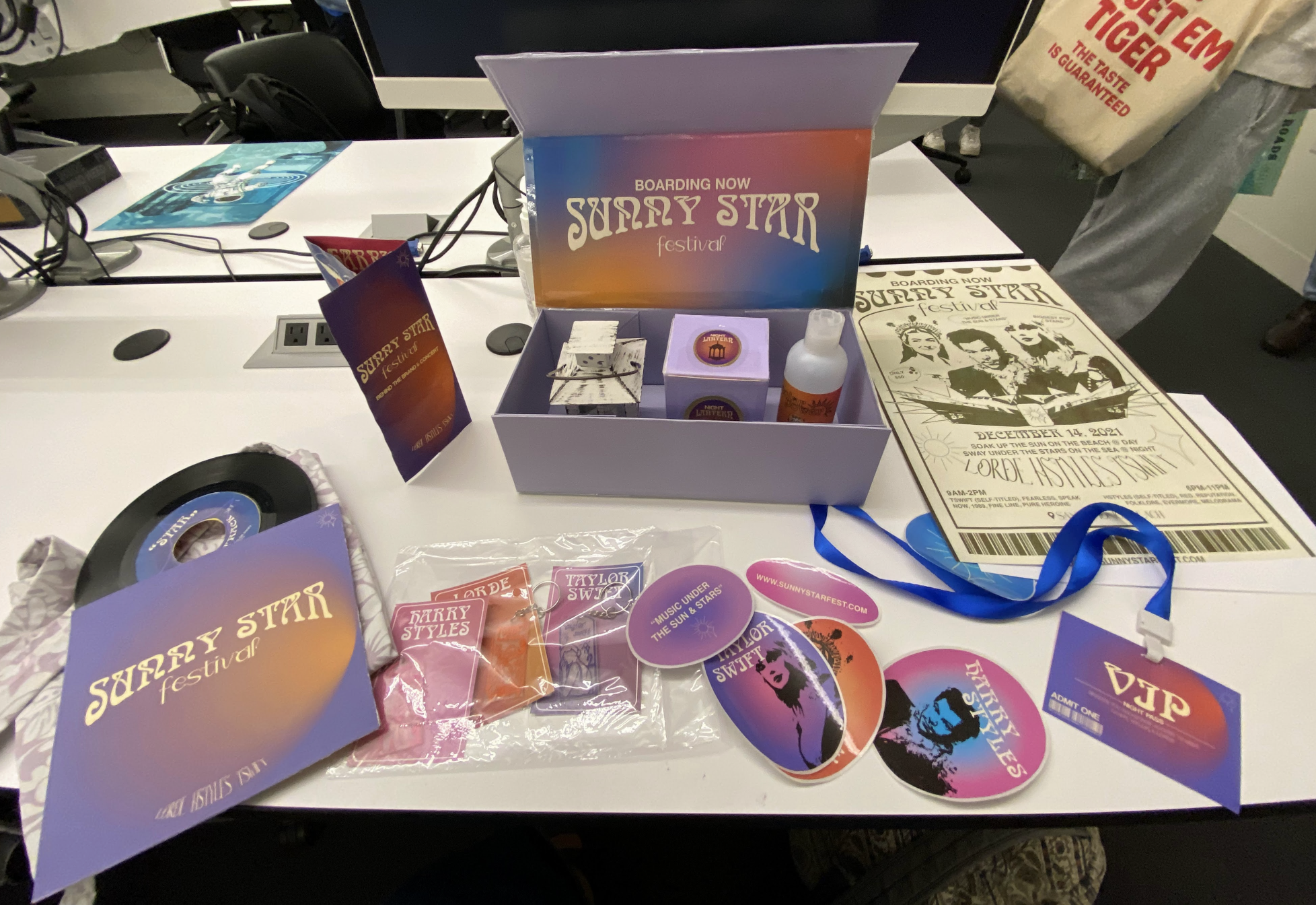 Through support from Jenn, my peers, and friends who’d been watching me grow on this semester-long journey, I was able to produce a full physical PR package for my festival. It consisted of a business card, poster, box, brochure, vinyl record sleeve and disc, VIP pass, a sunscreen bottle, keychain cards, and stickers.