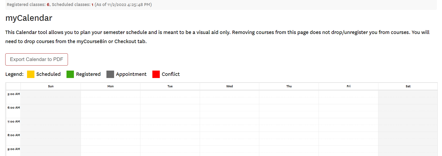 If you click on the myCalendar tab at the top, then you’re able to see all of your SCHEDULED classes from your Course Bin. If the class is Green, it means you’ve registered for it. If the class is Yellow, it means you’ve scheduled it but not registered for it yet. If the class is Red, it usually means that it is in conflict with another class that you’ve scheduled for the same semester.