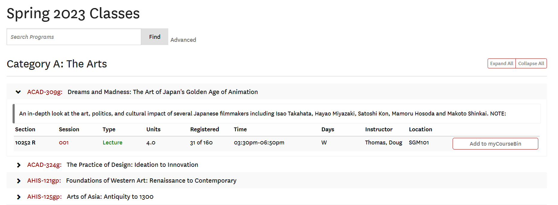 Once you choose a major/area of study, you’re able to see each of the classes available in that department. When you click on a class, you can see all of the information about that class, including a description, how many units, how many people are registered, the time of the class, which days the class takes place, the instructor, and the location of the class.